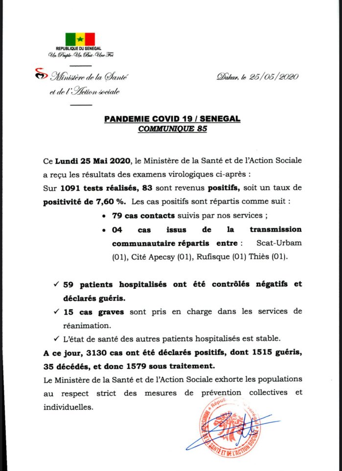 بحسب بيان وزارة الصحة والعمل الاجتماعي ، فإن 79 حالة اتصال تتابعها خدمات وزارة الصحة ،و 04 حالة ناتجة عن انتقال المجتمع مقسمة بين Scat Urbam 01 ، Cité Apecsi 01 و Rufisque 01 و Thiès 01.