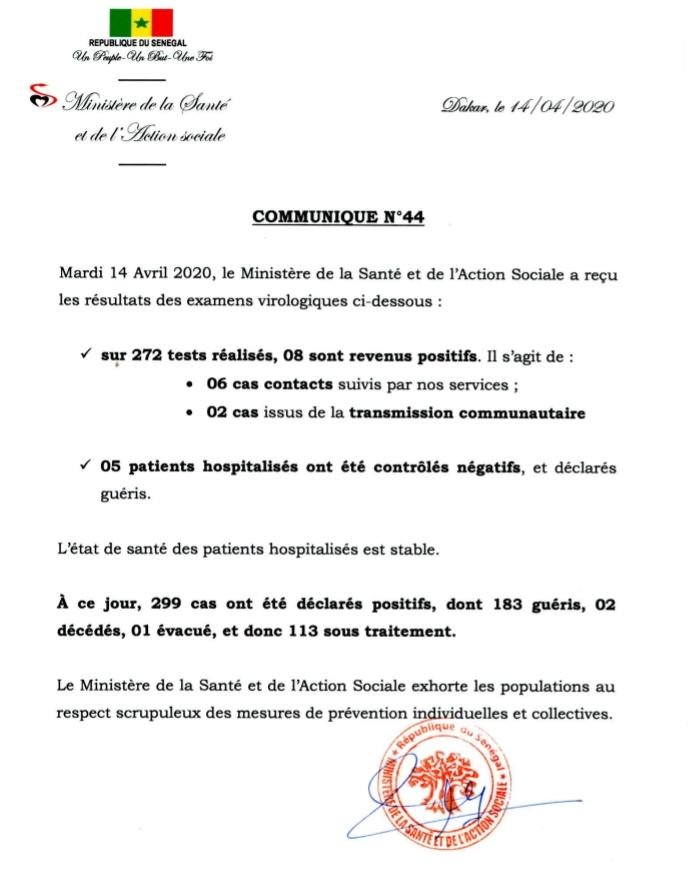 أوضخ بيان وزارة الصحة اليومي ال44 والمتعلق بحالة انتشار كورونا في السنغال :(الثلاثاء-14- أبريل – 2020) . أنه من ن أصل 272 شخص تم فحصهم، أسفرت النتائج عن ما يلي :