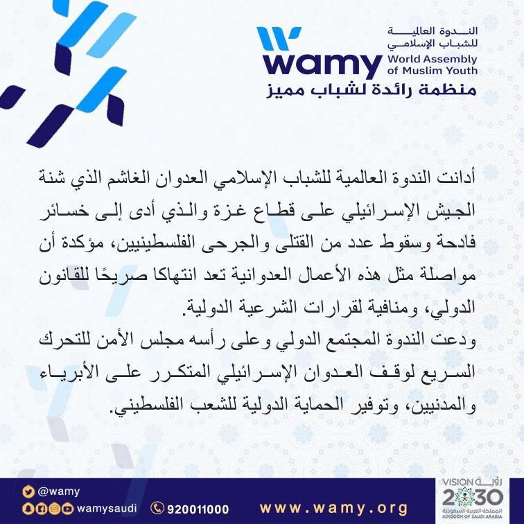 أدانت الندوة العالمية للشباب الإسلامي العدوان الغاشم الذي شنه الجيش الإسرائيلي على قطاع غزة ، والذي أدى إلى خسائر فادحة وسقوط عدد من القتلى والجرحى الفلسطينيين ، مؤكدة أن مواصلة مثل هذه الأعمال العدوانية تعد انتهاكا صريحا للقانون الدولي ، ومنافية لقرارات الشرعية الدولية.
