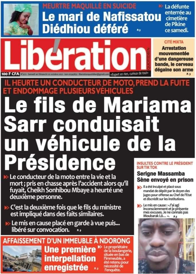 بالإعتماد على ما جاء في صحيفة ليبراتيون اليومية السنغالية في عددها الصادر صباح السبت، تم اعتقال نجل السيدة مريام سار وزيرة التشغيل والتكوين المهني لساعات قليلة قبل الإفراج عنه بموجب أمر من النيابة العامة.