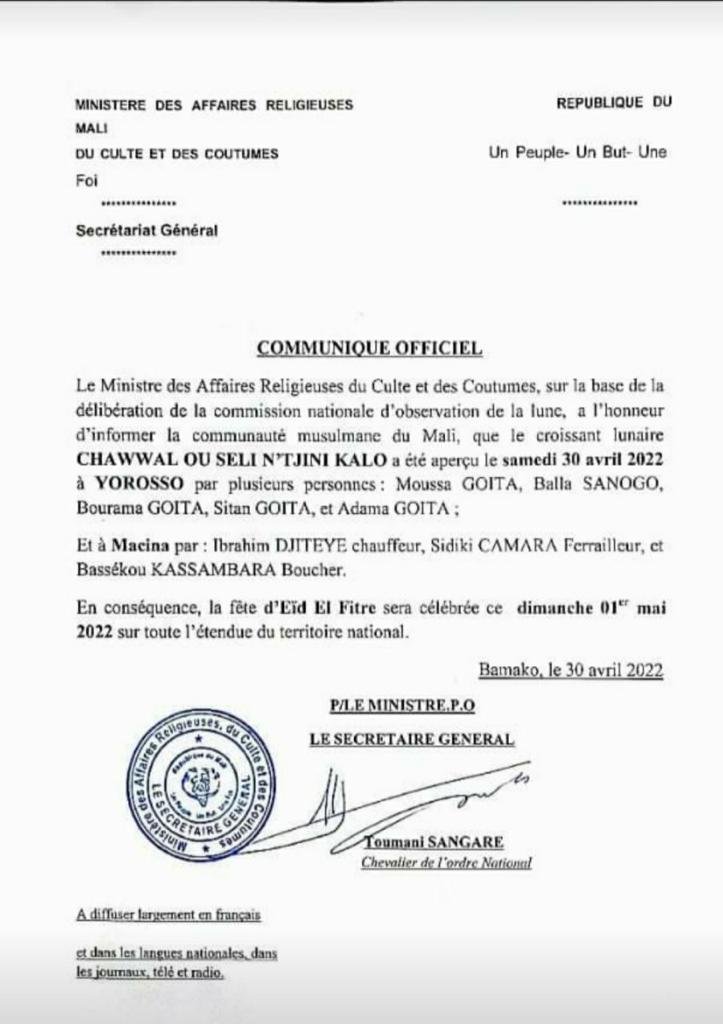 بيان رسمي يتشرف وزير الشؤون الدينية والعبادة على أساس مداولات اللجنة الوطنية لمراقبة الأهلة ، بإبلاغ الجالية المسلمة في مالي ، أن الهلال القمري شوال شوهد السبت 30 أبريل 2022 في يوروسو من قبل عدة أشخاص: موسى غويتا ، بالا سانوغو ، بوراما غويتا ، سيتان غويتا ، أداما غويتا ؛ وفي ماسينا: إبراهيم دجيتي سائق ، وصديقي كامارا ، وباسيكو كسامبارا.