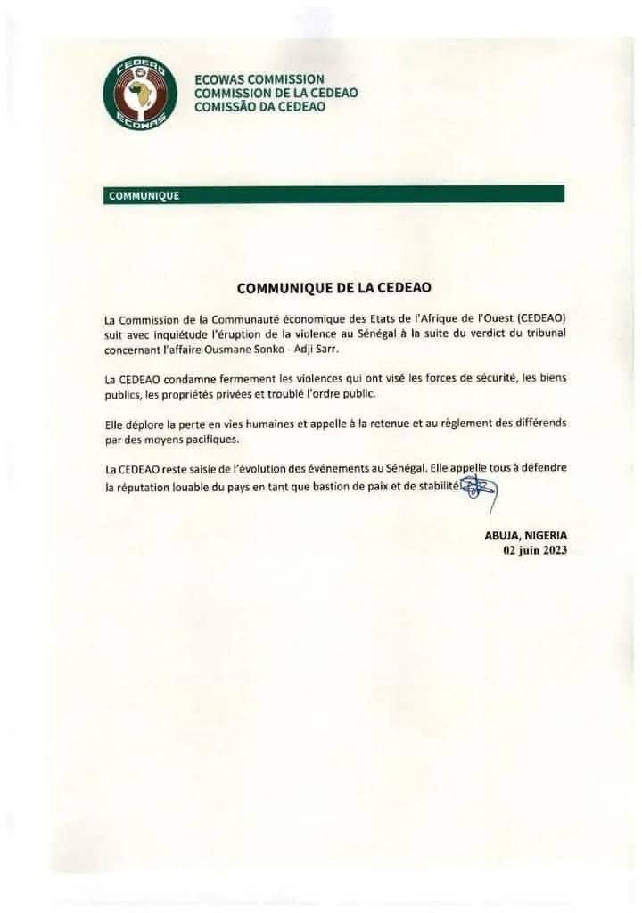 فرنسا تتابع بقلق بالغ أحداث العنف التي اندلعت في السنغال أمس، و التي أودت بحياة 9 أشخاص ، و تعزي أسر الضحايا. كما تدعو إلى ضبط النفس و وقف العنف ، و تسوية هذه الأزمة عبر احترام العرف الديموقراطي الطويل الذي عرفه السنغال