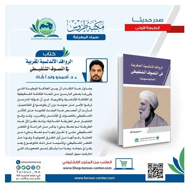 صدر كتاب “الروافد الأندلسية المغربية في التصوف الشنقيطي (الشاذلية نموذجا)” للدكتور أحمدو ولد آكَّاهْ ويقع الكتاب الجديد، الصادر عن “مركز طروس للنشر والتوزيع”، المختص في دراسات الشرق الأوسط بدولة الكويت، في 220 صفحة من الحجم المتوسط، ويتضمن مقدمة وتمهيدا وأربعة فصول وخاتمة وفهارس.