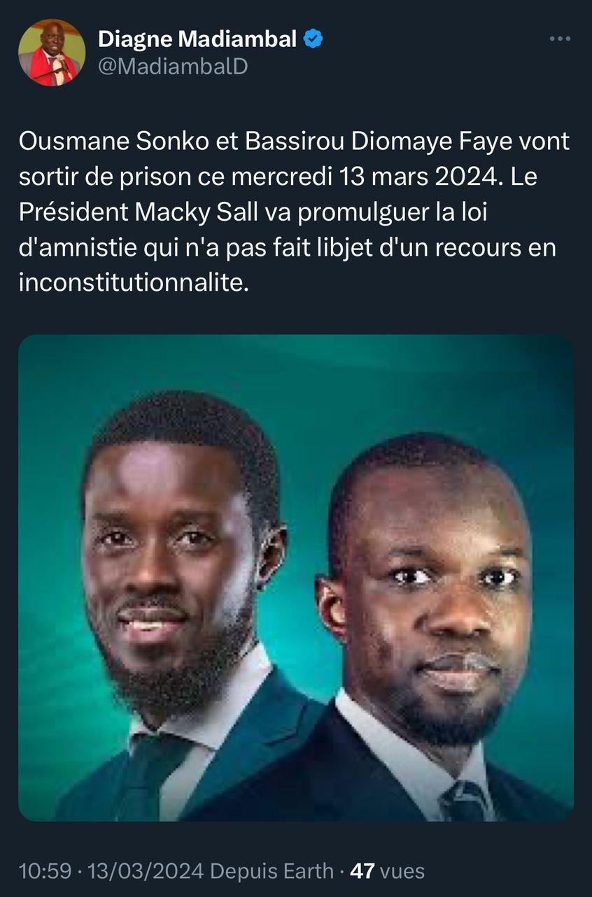 أعلن الصحفي “ماجمبال جانج “عن إطلاق سراح كل من عثمان سونكو. وبشير جماي فاي ، ووفقًا لمالك صحيفة Le Quotidien ، فإن رئيس الجمهورية ماكي سال “سيصدر اليوم (الاربعاء ، 13 مارس) قانون العفو الذي لم يلق طعونا لعدم الدستورية