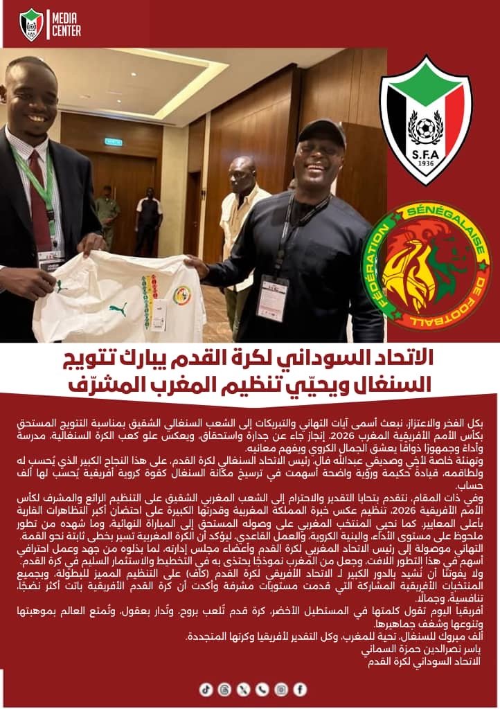 قدم الاتحاد السوداني لكرة القدم التهنئة لنظيره السنغالي والى الشعب السنغالي الشقيق بمناسبة التتويج المستحق بكأس الأمم الأفريقية المغرب 2026 ، مؤكدا انه إنجاز جاء عن جدارة وإستحقاق، ويعكس علو كعب الكرة السنغالية، مدرسةً وأداءً وجمهورًا ذواقًا يعشق الجمال الكروي ويفهم معانيه.