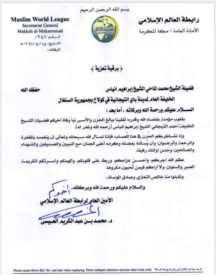 بعث الامين العام لرابطة العالم الاسلامي محمد العيسى برقية تعزية ومواساة إلى الشيخ محمد الماحي إبراهيم نياس، إثر وفاة الشيخ أحمد التجاني إبراهيم نياس، الخليفة العام للأسرة التجانية نياس بمدينة كولخ.