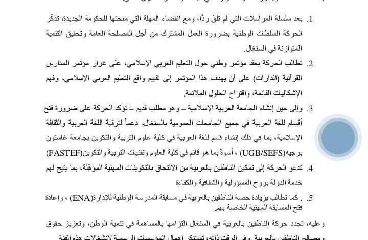1. وإلى حين إنشاء الجامعة العربية الإسلامية – وهو مطلب قديم – تؤكد الحركة على ضرورة فتح أقسام للغة العربية في كل الجامعات العمومية بالسنغال، دعماً لترقية اللغة العربية والثقافة الإسلامية، بما في ذلك إنشاء قسم للغة العربية في كلية علوم التربية والتكوين بجامعة غاستون برجيه (UGB/SEFS) ، أسوة بما هو قائم في كلية العلوم وتقنيات التربية والتكوين (FASTEF).