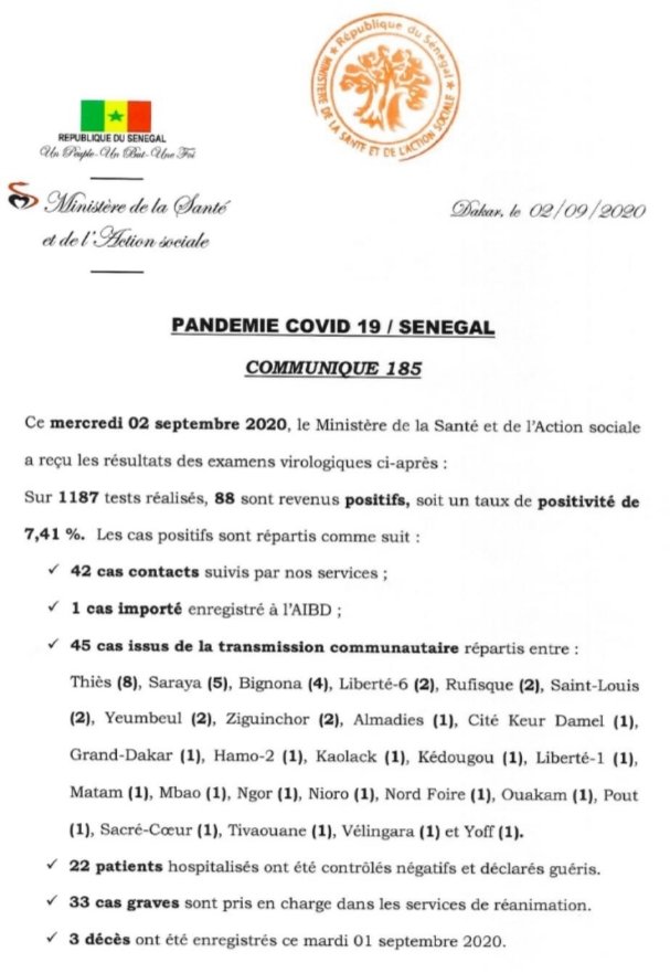 اعلنت وزارة الصحة اليوم الاربعاء 2سبتمبر انه من بين 1187 اختبارًا تم إجراؤها ، جاءت نتائج 88 إيجابية لفيروس كورونا ، أي بنسبة إيجابية 7.41٪. من بينها 42 حالة اتصال متابعة ، وحالة واحدة مستوردة عبر المطار (AIBD) و 45 حالة ناتجة عن انتقال المجتمع موزعة على النحو التالي: