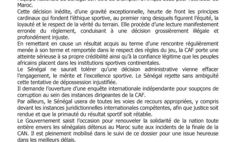 تعرب حكومة السنغال عن استيائها الشديد إزاء القرار الذي ،اتخذته لجنة الاستئناف التابعة للاتحاد الأفريقي لكرة القدم (CAF)، والذي يهدف إلى تجريد المنتخب السنغالي من لقب بطل أفريقيا 2025 ومنحه للمغرب.