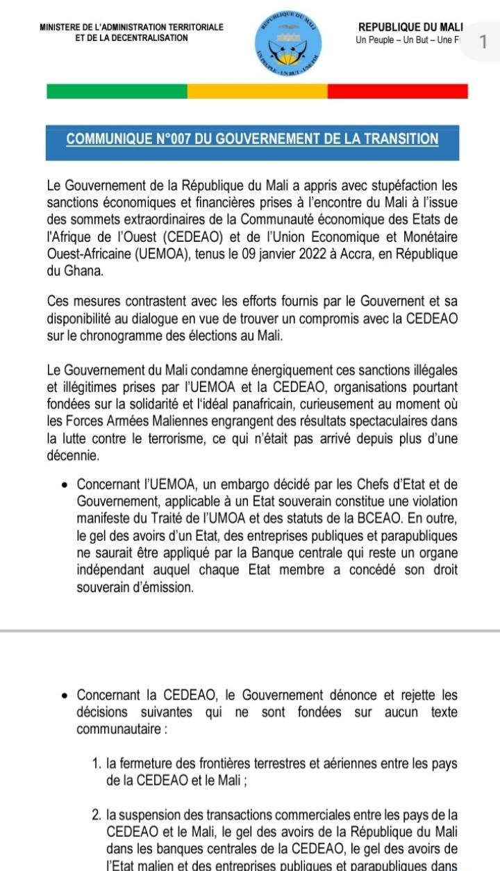 أدانت الحكومة المالية بشدة العقوبات المفروضة على البلاد من طرف المجموعة الاقتصادية لدول غرب إفريقيا “إيكواس” والاتحاد الاقتصادي والنقدي لغرب إفريقيا، واصفة إياها ب”غير القانونية وغير المشروعة”.