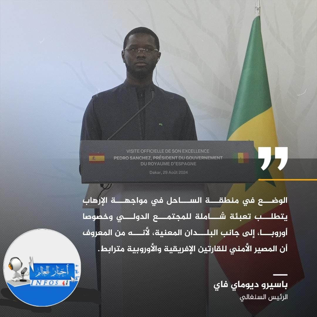 دعا الرئيس السنغالي بشير ديوماي فاي، أوروبا إلى الإسهام بشكل أكبر في مكافحة عدم الاستقرار في منطقة الساحل. وقال في مؤتمر صحفي مشترك في دكار اليوم 29 أغسطس 2024 مع رئيس الوزراء الإسباني “بيدرو سانشيز “إن المصير الأمني للقارتين الإفريقية والأوروبية مترابط. وشهدت زيارة سانشيز للسنغال توقيع اتفاقية تنص على تدريب للعمال السنغاليين في إسبانيا.