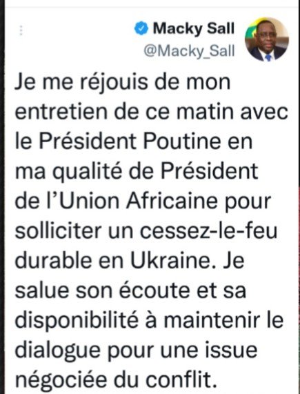 - اتصل الرئيس السنغالي ماكي صال بصفته الرئيس الدوري للاتحاد الإفريقي، صباح اليوم الأربعاء بالرئيس الروسي فلاديمير بوتين.