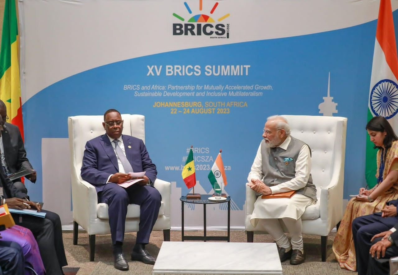 بحث رئيس الجمهورية “ماكي صال” على عامش مشاركته في قمة بريكس في جنوب أفريقيا مع رئيس الوزراء الهندي “ناريندرا مودي” التعاون الثنائي بين السنغال والهند.