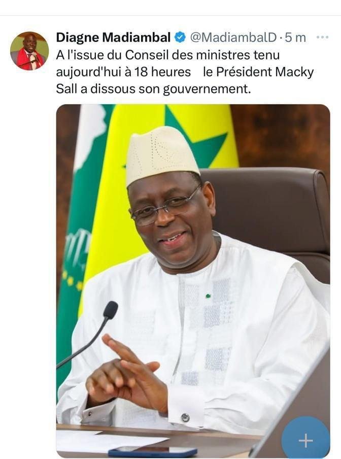 أعلن الصحافي ورئيس المجموعة الإعلامية “أفينير للاتصالات ” ماجمبال جانج ، بأن رئيس الدولة ماكي سال قام بحل الحكومة في ختام جلسة مجلس الوزراء مساء اليوم الأربعاء