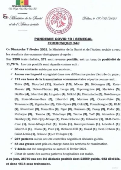 حتى الآن ، يوجد في السنغال 28760 حالة إيجابية ، بما في ذلك 23559 حالة شفيت و 682 حالة وفاة و 4518 لا تزال قيد العلاج.