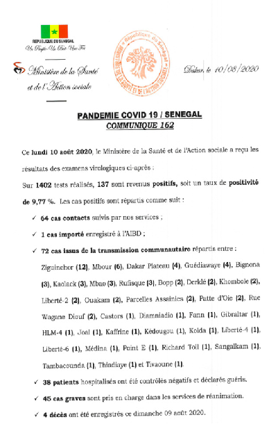 من بين 1402 اختبارًا تم إجراؤها ، جاءت 137 اختبارًا إيجابية لفيروس كورونا ، أي بمعدل إيجابي بنسبة 9.77٪. من بينها 64 حالة اتصال متابعة ، وحالة واحدة مستوردة عبر المطار(AIBD) و 72 حالة ناتجة عن انتقال المجتمع موزعة على النحو التالي: