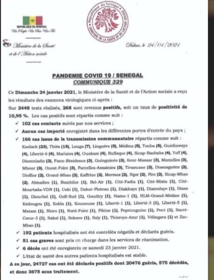 أعلنت وزارة الصحة والعمل الاجتماعي عن تقييمها للوضع اليومي لتطور Covid-19 في السنغال ، يوم الأحد 24 يناير 2021.