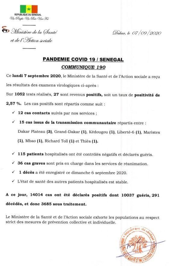 وسجلت السنغال حتى الآن 14014 حالة إيجابية ، منها 1037 شُفيت و 291 حالة وفاة و 3685 لا تزال قيد العلاج.