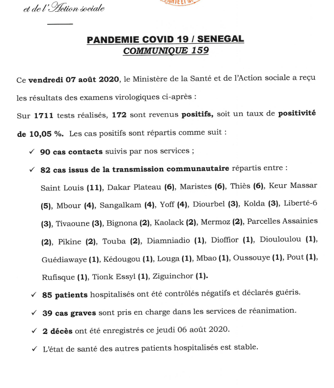 السنغال: ثبتت إصابة 172 حالة جديدة بفيروس كورونا و 85 حالة تعافي جديدة