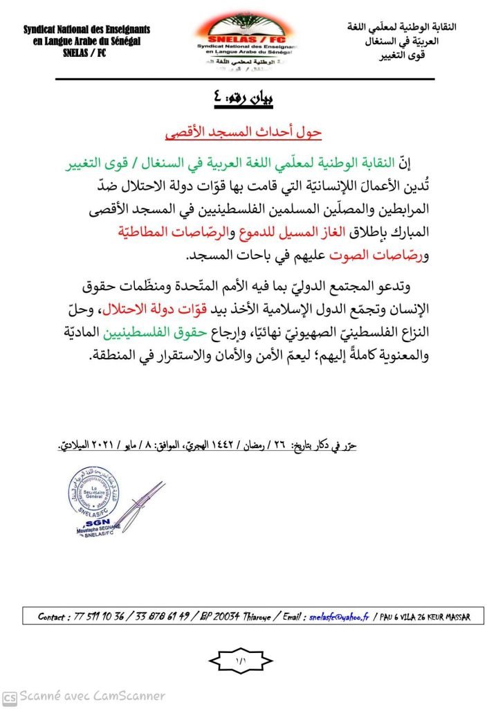 السنغال حول التصعيد الخطير بالقدس.. النقابة الوطنية لمدرسي اللغة العربية في السنغال تدعو المجتمع الدولي إلى التدخل لحل النزاع الفلسطيني الصهيوني نهائيا مع الحفاظ على حقوق الفلسطينيين.