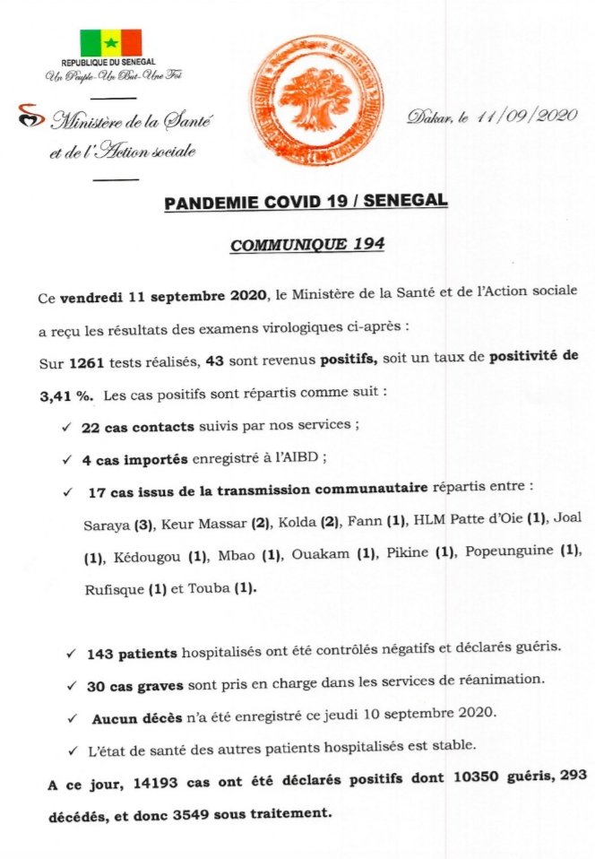حتى الآن ، يوجد في السنغال 14193 حالة إيجابية ، بما في ذلك 10،350 شفي و 293 حالة وفاة و 3549 لا يزال قيد