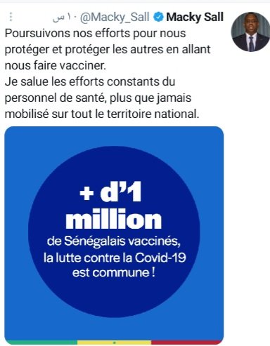 وجه الرئيس السنغالي ماكي صال تحية عبر حسابه على اتويتر إلى العاملين في مجال الصحة ، وذلك بمناسبة تجاوز البلاد عتبة مليون و100 ألف ملقح.