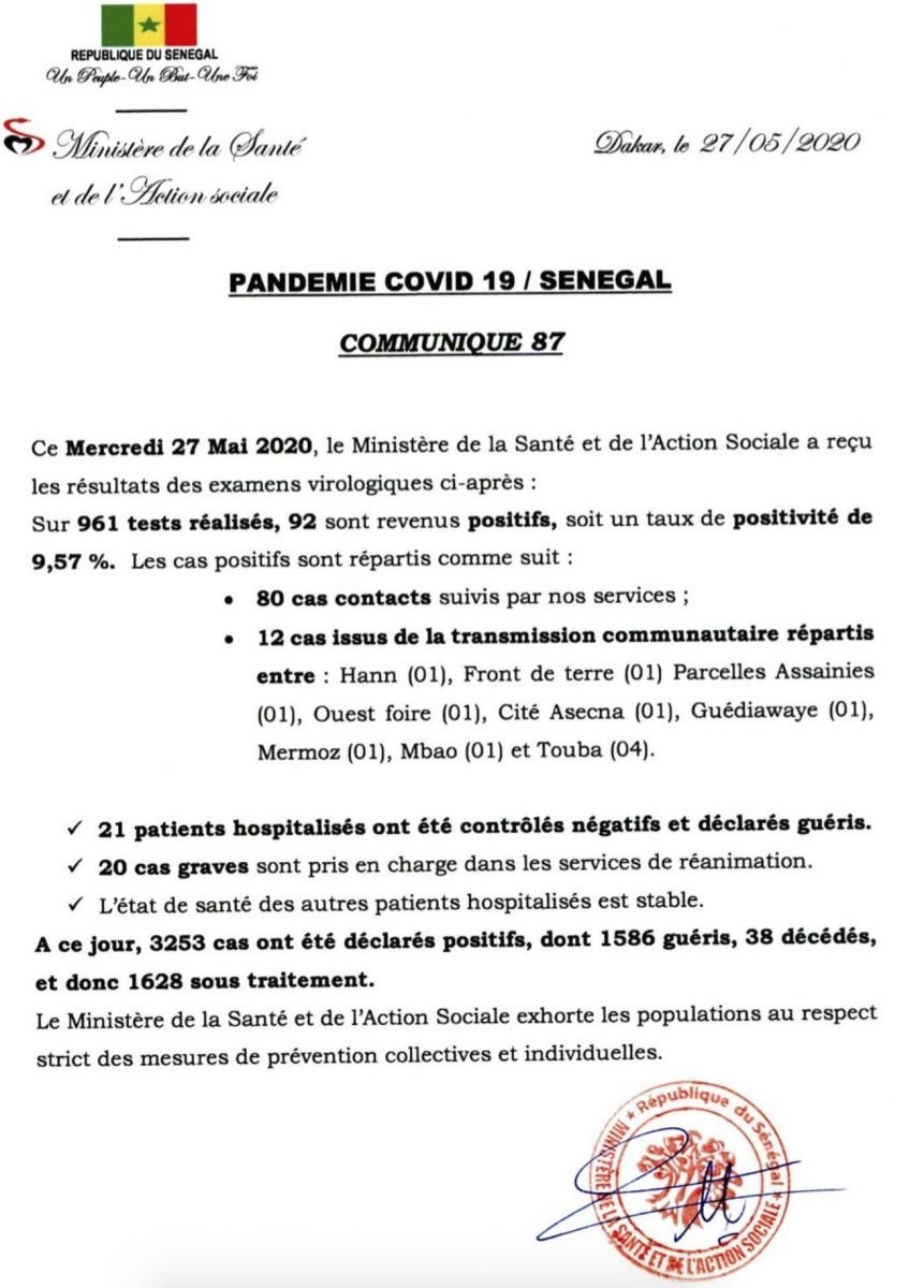 أفاد البيان الصحفي رقم 87 لوزارة الصحة والعمل الاجتماعي ، تم الإعلان عن 92 حالة جديدة إيجابية يوم الأربعاء 27 مايو ، من أصل 961 اختبارًا تم إجراؤها. أي بمعدل 9.57٪.