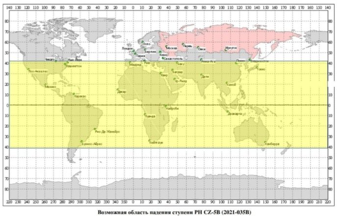 ونشر المدير التنفيذي لـ”روس كوسموس” دميتري روغوزين على قناته في تطبيق “تيليغرام” خريطة تظهر المنطقة التي قد تسقط فيها، حسب تقييمات روسيا، المرحلة الخارجة عن السيطرة التي يبلغ وزنها 18 طنا من الصاروخ Long March 5B (CZ-5B).