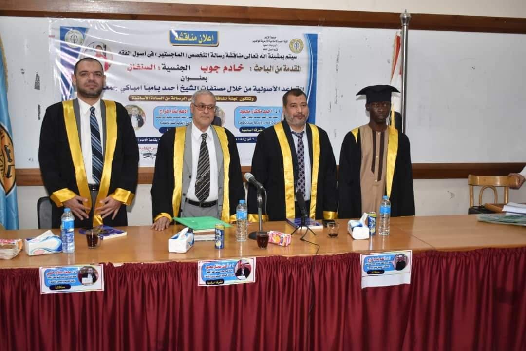 بجامعة الأزهر الشريف بمصر، وبمقر كلية العلوم الإسلامية الأزهرية للوافدين بقاعة فضيلة الإمام الأكبر الأستاذ الدكتور أحمد الطيب، وبصحبة الأساتذة الكرام فضيلة الأستاذ الدكتور أحمد مختار ، أستاذ أصول الفقه المساعد المتفرغ بكلية الدراسات الإسلامية والعربية للبنين بالقاهرة، وفضيلة الأستاذ الدكتور محمد صلاح أستاذ أصول الفقه المساعد ورئيس قسم أصول الفقه بكلية الشريعة والقانون بالقاهرة، والأستاذ الدكتور أدهم تمام الأستاذ المساعد بقسم أصول الفقه بكلية الدراسات الإسلامية بنين بالقاهرة، حصل الباحث خادم جوب سنغالي الجنسية على درجة التخصص الماجستير فى أصول الفقه بتقدير جيد جيدا، وموضوع الرسالة( القواعد الأصولية من خلال مصنفات الشيخ أحمد بامبا أمباكي جمعا ودراسة )