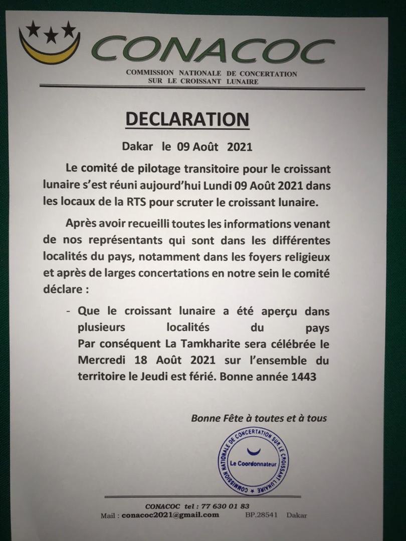 بسم الله الرحمان الرحيم، الحمد لله،والصلاة والسلام على رسول الله،وآله وصحبه ومن والاه، سبحانك لا علم لنا الا ما علمتنا انك انت العليم الحكيم. لقد اجتمع أعضاء اللجنة الوطنية للتشاور حول الاهلة،كالمعتاد،في دار الاذاعة والتلفزة الوطنية السنغالية،RTS،لمراقبة هلال محرم الحرام،في الديار السنغالية،وبعد التحري والتمحيص والاستقصاء والبحث والمراقبة الكثيفة والدقيقة والشاملة من قبل اعضاءها وسائر المهتمين بشأن الهلال في البلاد،تبين على ان الهلال لاح وبان وظهر في كل من منطقة “بدور”بالضبط مدينة چانتبي،واقليم”سام لوي”بالضبط في مسجد “الانصار”ومسجد الشيخ ماجور سيسي،وكذلك في اقليم كفرين..وبناء على هذه الاخبار المتبينة والصحيحة لدينا،اكدت اللجنة وصححت هذه الاخبار طبقا لشروط الشريعة الإسلامية في ذلك،وعليه فان اللجنة تعلن ما يلي: _اليوم الاول لشهر محرم الحرام هو يوم الثلاثاء الموافق 10غشت،آب،2021،وليلة عاشوراء سيوافق يوم الاربعاء 9 محرم1443هجرية،الموافق18 غشت2021 ميلادية،ويوم عاشوراء الخميس الموالي 10 محرم1443هجرية،وسيكون عيدا وطنيا،واللجنة إذ تزف اليكم هذه البشرى فإنما تدعو الباري جل وعلا ان يجعل هذا العام الهجري عام رفاهية وازدهار على الأمة الإسلامية قاطبة وعلى الشعب السنغالي بصفة خاصة،وما ذلك على الله بعزيز، انه ولي ذلك و القادر عليه،وصلى الله وسلم وبارك على سيدنا محمد وآله وصحبه اجمعين