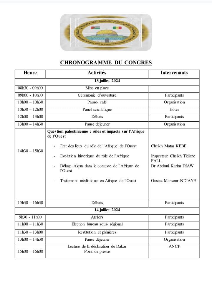 التحالف الوطني لدعم القضية الفلسطينية في السنغال بالتعاون مع الائتلاف العالمي للتضامن مع القدس وفلسطين ينظم اللقاء الرابع الغرب الإفريقي حول القضية الفلسطينية بتاريخ 12/13 يوليو في المعهد الإسلامي بدكار.