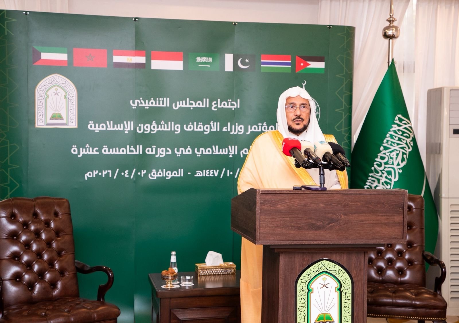 صدر اليوم الخميس 14 شوال 1447هـ الموافق 2 أبريل 2026م البيان الختامي للدورة الخامسة عشرة للمجلس التنفيذي لمؤتمر وزراء الأوقاف والشؤون الإسلامية بدول العالم الإسلامي، الذي عُقد عبر الاتصال المرئي من مكتب معاليه بمحافظة جدة بالمملكة العربية السعودية برئاسة معالي وزير الشؤون الإسلامية والدعوة والإرشاد الشيخ الدكتور عبداللطيف بن عبدالعزيز آل الشيخ، رئيس المجلس التنفيذي للمؤتمر، وبمشاركة أصحاب المعالي الوزراء الأعضاء في المجلس التنفيذي من المملكة الأردنية الهاشمية، وجمهورية إندونيسيا، وجمهورية باكستان الإسلامية، وجمهورية غامبيا، ودولة الكويت، وجمهورية مصر العربية، والمملكة المغربية.