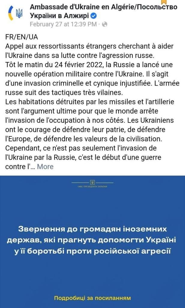 وقامت سفارة كييف لدى الجزائر بسحب المنشور الذي دعت فيه المواطنين إلى التجند والدفاع عن أوكرانيا في حربها الحالية ضد روسيا.