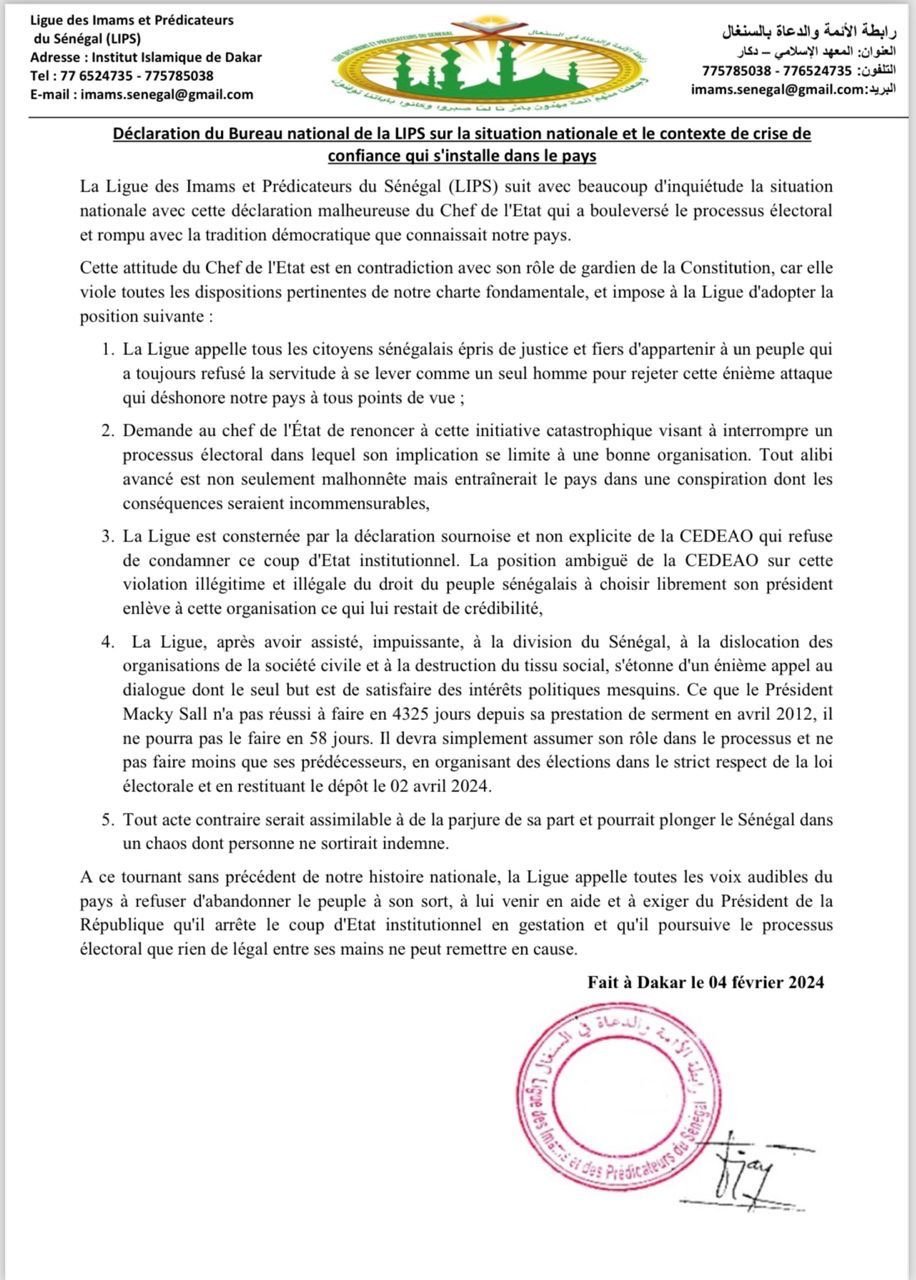 تتابع رابطة الأئمة والدعاة بالسنغال (LIPS) الوضع الوطني بقلق بالغ إزاء هذا الإعلان المؤسف لرئيس الدولة الذي عطل العملية الانتخابية وكسر التقاليد الديمقراطية التي عرفتها بلادنا.