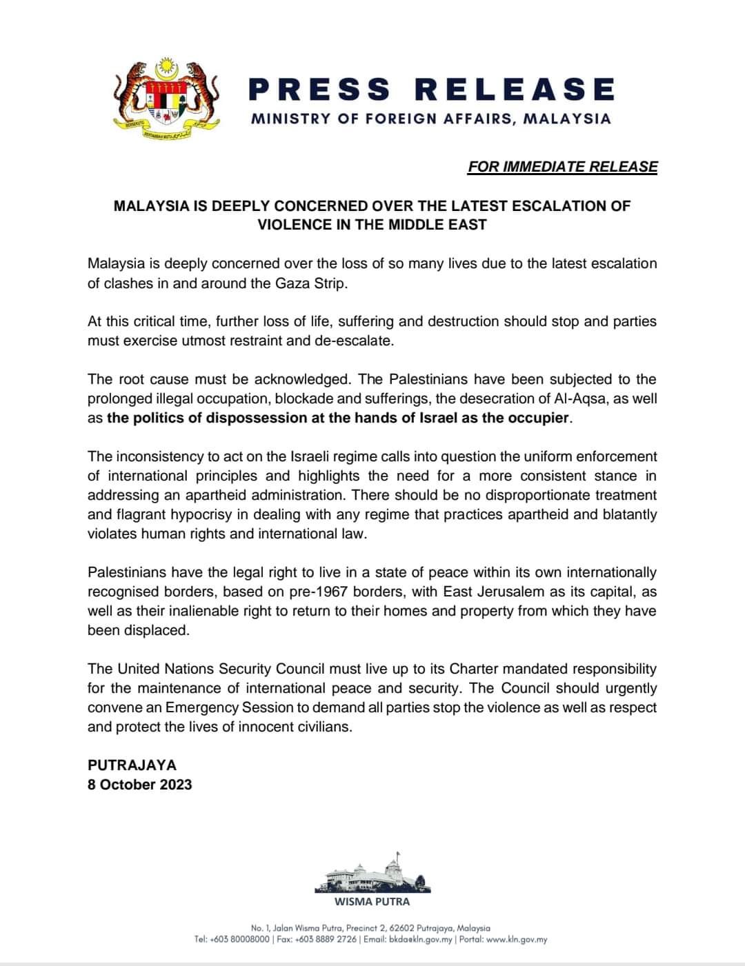 مالیزیا تشعر بقلق عمیق إزاء التصعید الأخیر للعنف في الشرق الأوسط
