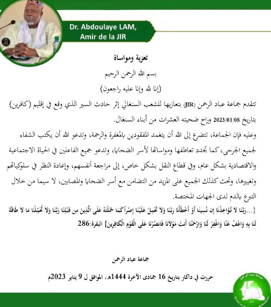 تتقدم جماعة عباد الرحمن بتعازيها للشعب السنغالي اثر حادث السير الذي وقع في اقليم كافرين بتاريخ 08-01-2022 وراح ضحيته العشرات من ابناء السنغال .