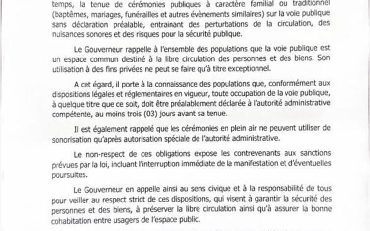 حذّر حاكم إقليم داكار من تزايد ظاهرة إقامة الاحتفالات ذات الطابع العائلي أو التقليدي، مثل حفلات الزواج والمعموديات والجنازات، في الطرق والأماكن العمومية من دون إشعار مسبق، مؤكدًا أن هذا السلوك يؤدي إلى عرقلة حركة المرور وإحداث ضجيج ومخاطر على السلامة العامة.