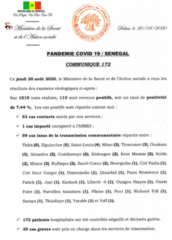 خلال التحديث اليومي للوضع الوبائي ، اعلن الدكتور مدير الصحة الحاج مامادو ندياي عن 113 حالة إيجابية بما في ذلك 53 مخالطًا ، وحالة واحدة تم استيرادها عبر مطار AIBD و 59 من انتقال مجتمعي تم تحديدها في مناطق مختلفة من البلاد:
