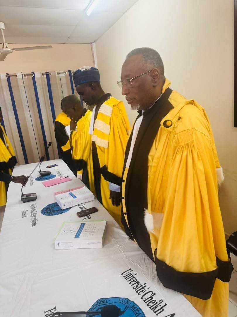 وتكوّنت لجنة التحكيم من نخبة من الأساتذة الباحثين، برئاسة الأستاذ الدكتور مدو نداي، وبمشاركة الأستاذ الدكتور أمادو تيجاني ديالو، والدكتور ساليو نداي، فيما تولى الأستاذ الدكتور ماغي نداي الإشراف على الأطروحة. وحضر بوصفه ممتحناً خارجياً الأستاذ الدكتور محمد الحنفي دهاه من جامعة نواكشوط العصرية.