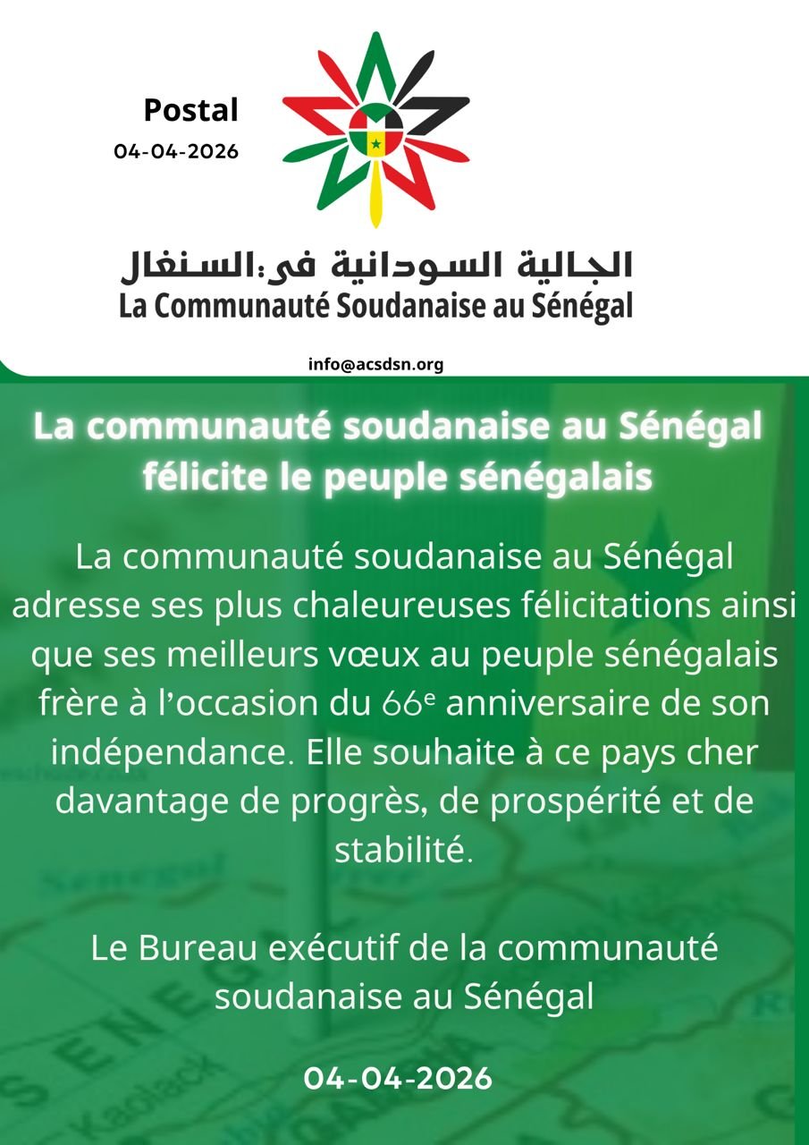 تقدّمت الجالية السودانية المقيمة في جمهورية السنغال بأحرّ التهاني وأصدق التبريكات إلى الشعب السنغالي، وذلك بمناسبة الذكرى السادسة والستين لعيد الاستقلال.