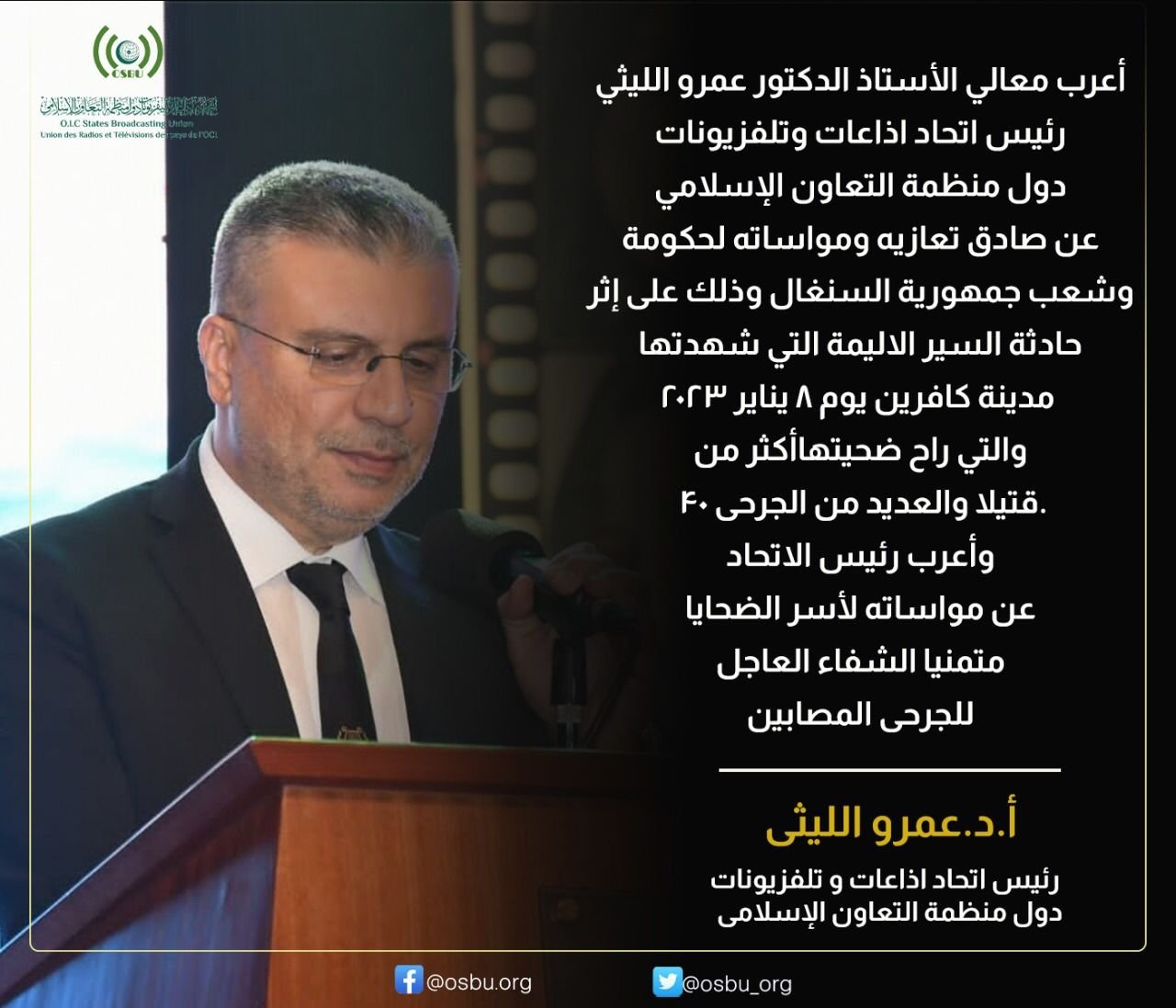 أعلن الأستاذ الدكتور عمرو الليثي رئيس إتحاد الإذاعات وتلفزيونات دول منظمة التعاون الإسلامي عن صادق تعازيه ومواساته لحكومة وشعب جمهورية السنغال جراء الحادث الأليم الذي أدّى إلى وفاة أكثر من 39 شخصا و أكثر من 135 مصابا فجر الأحد في مقاطعة كافرين شرق البلاد