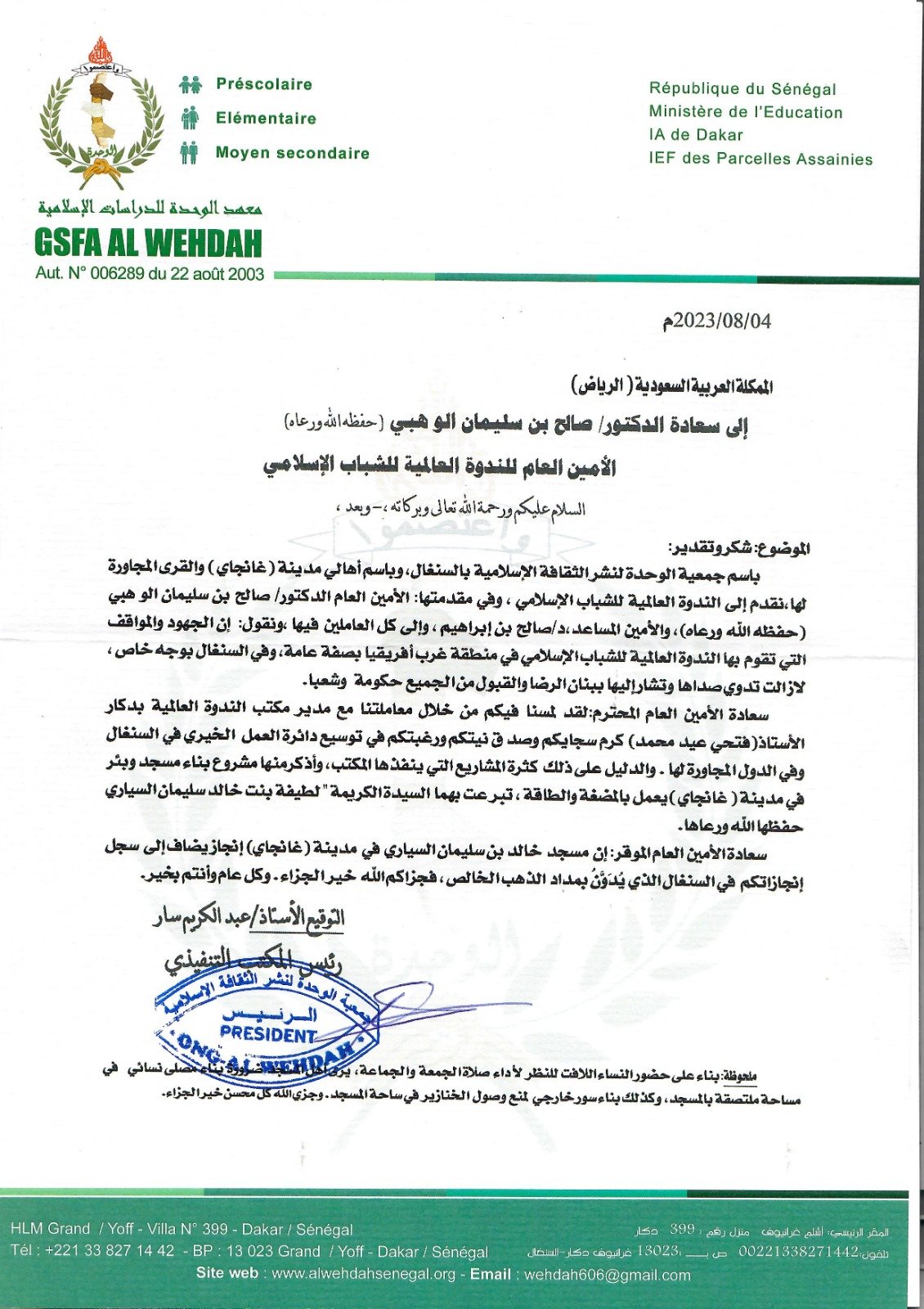 بعث الأستاذ عبد الكريم سار رئيس جمعية الوحدة لنشر الثقافة الإسلامية بالسنغال بخطاب الشكر والتقدير لمعالي الأمين العام للندوة العالمية للشباب الإسلامي الدكتور صالح الوهيبي ، عبر فيه عن شكره وامتنانه لجهود الندوة في السنغال عبر مكتبها في دكار ،