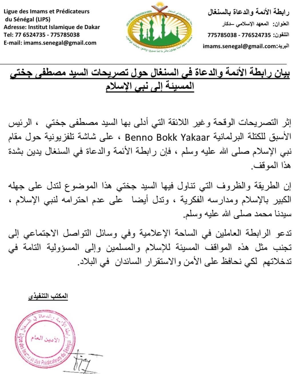 إثر التصريحات الوقحة وغير اللائقة التي أدلى بها السيد مصطفى جختي الرئيس الاسبق للكتلة البرلمانية benoo bokk yakaar على شاشة تليفزيونية حول مقام النبي صلى الله عليه وسلم فان رابطة الائمة والدعاة في السنغال تدين بشدة هذا الموقف .