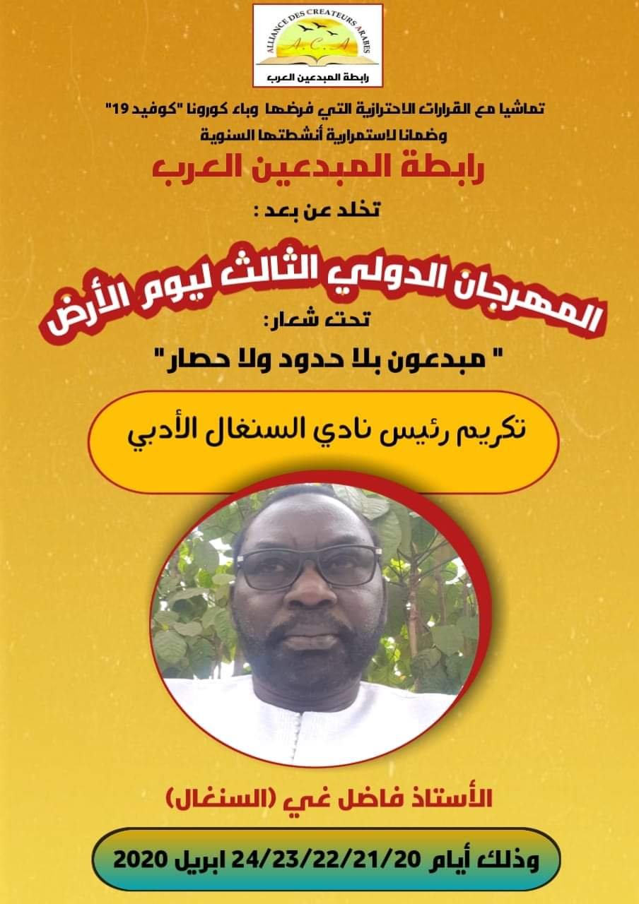 أعلنت رابطة المبدعين العرب، أنه وبسبب الظروف الحالية وتنفيذا للقرارات الاحترازية وضمانا لاستمرار نشاطها فقد حددت تاريخ يوم 20 ابريل الجاري كموعد لتنظيم المهرجان الدولي الثالث ليوم الأرض، تحت شعار: مبدعون بلا حدود ولا حصار، وسينظم المؤتمر افتراضيا عبر وسائل التواصل الالكتروني، ومن ضمن المشاركين بمهرجان يوم الارض ممثل الرابطة بافريقيا محمد الامين جوب الحاصل على جائزة أمير الشعراء بالإمارات والاستاذ فاضل غي رئيس النادي الادبي السنغالي..
