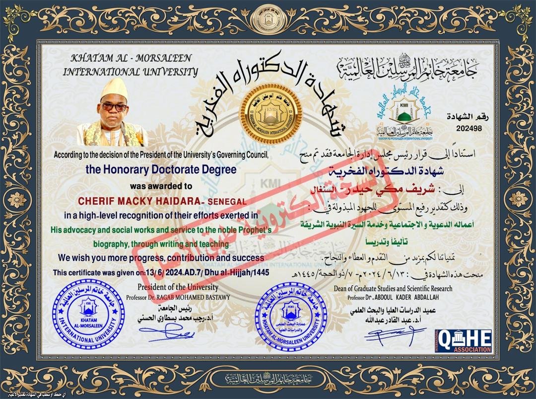 نظرا للخدمات الجليلة التي قدمها ويقدمها للإسلام والمسلمين ،ودوره الكبير في تعليم القرآن واللغة العربية ،والسعي الدائم إلى كل ما يوحد أبناء الأمة الإسلامية ،منحت جامعة خاتم المرسلين العالمية للشيخ شريف مكي حيدر شهادة دكتوراه الفخرية كتقدير رفيع المستوى للجهود المبذولة في أعماله الدعوية والإجتماعية وخدمة السيرة النبوية تدريسا وتأليفًا وفق شهادة كل من البروفيسور الدكتور عبد القادر عبد اللهَ عميد الدراسات العليا والبحث العلمي للجامعة