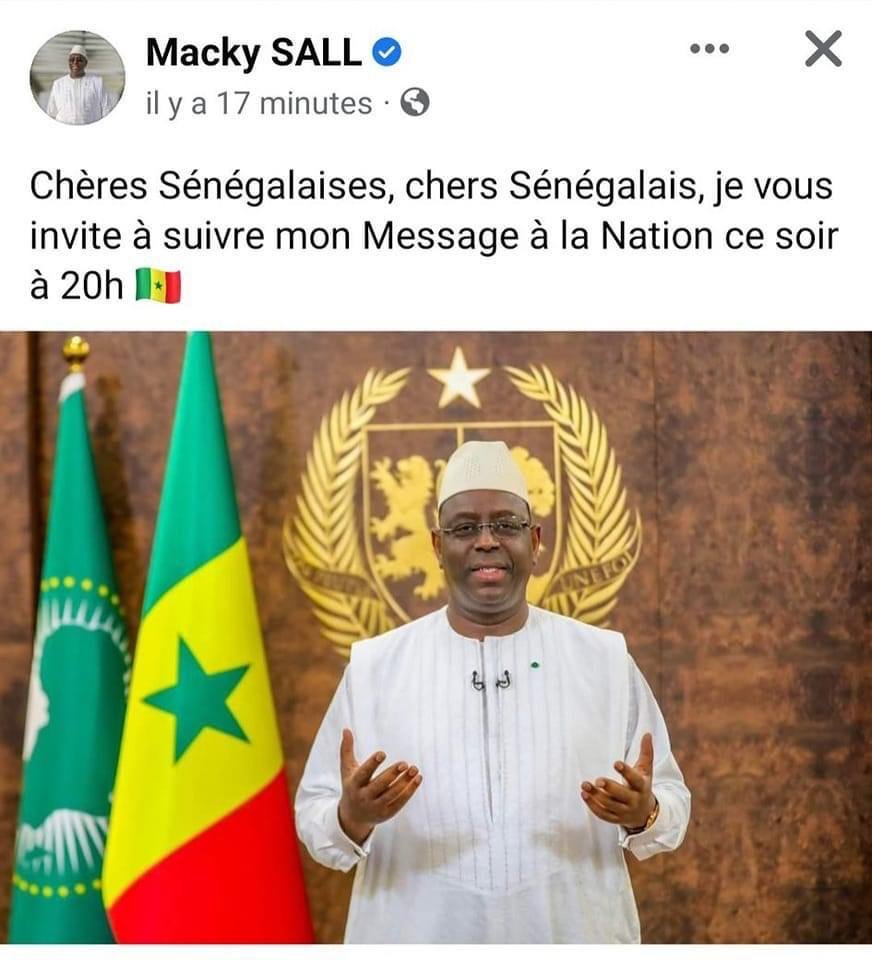 دعا الرئيس “صال” في منشور له في فيسبوك جميع المواطنين إلى متابعة الخطاب الذي يوجهه إليهم الليلة في الساعة الثامنة بتوقيت دكار