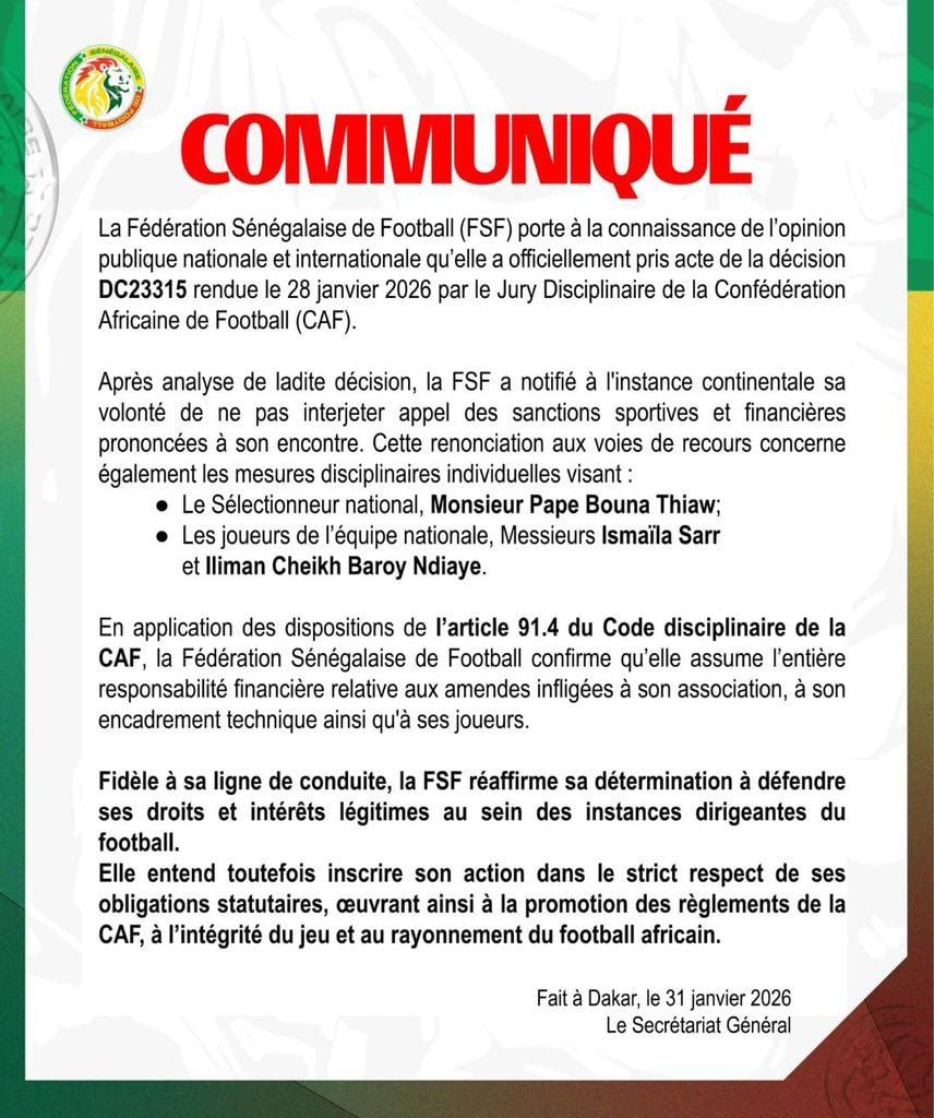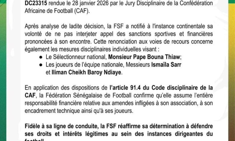 ورغم قبوله لهذه القرارات، شدد الاتحاد السنغالي لكرة القدم على تمسكه بالدفاع عن حقوقه ومصالحه المشروعة داخل الهيئات الكروية القارية، مؤكداً في الوقت نفسه التزامه الصارم باحترام أنظمة الكاف والعمل على ترسيخ نزاهة المنافسات، والحفاظ على صورة كرة القدم الإفريقية وإشعاعها قارياً ودولياً