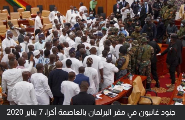 دخلت قوة من الجيش الغاني إلى مقرّ البرلمان ليل الأربعاء لإعادة الهدوء إثر شجار بين نواب الحزب الحاكم والمعارضة التي قاطعت تنصيب الرئيس نانا اكوفو-ادو خلال حفل جرى بعد ظهر الخميس.