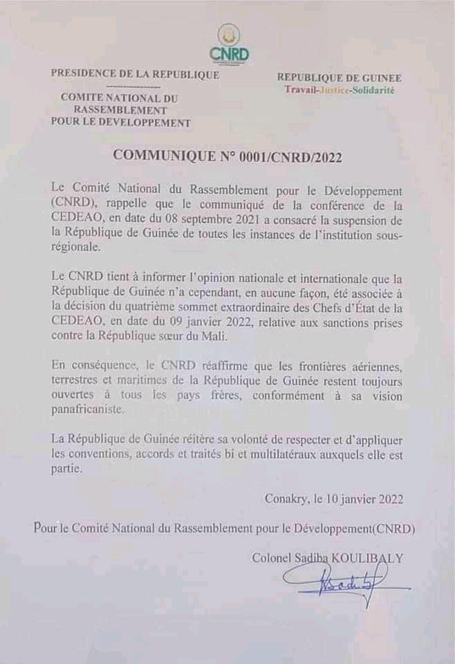 وأوضح بيان صادر عن اللجنة، بثه مساء أمس التلفزيون الرسمي الغيني، أن “حدود غينيا الجوية والبرية والبحرية تظل مفتوحة على الدوام لجميع البلدان الشقيقة تماشيا مع الإرادة الوحدوية الإفريقية”.