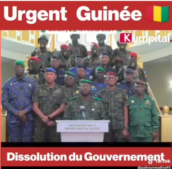 وظهر الوزير الأمين العام لرئاسة غينيا ، أمام الكاميرا، محاطًا بالجنود، يقرأ المرسوم لمدة تزيد عن ثلاث دقائق مساء الاثنين 19 فبراير.